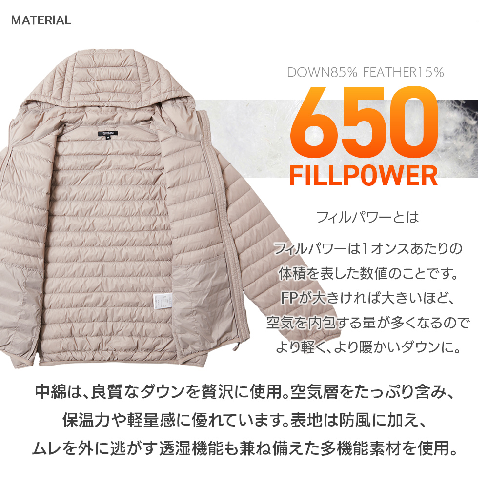 中わたは650FP(フィルパワー)のかさ高を持つ